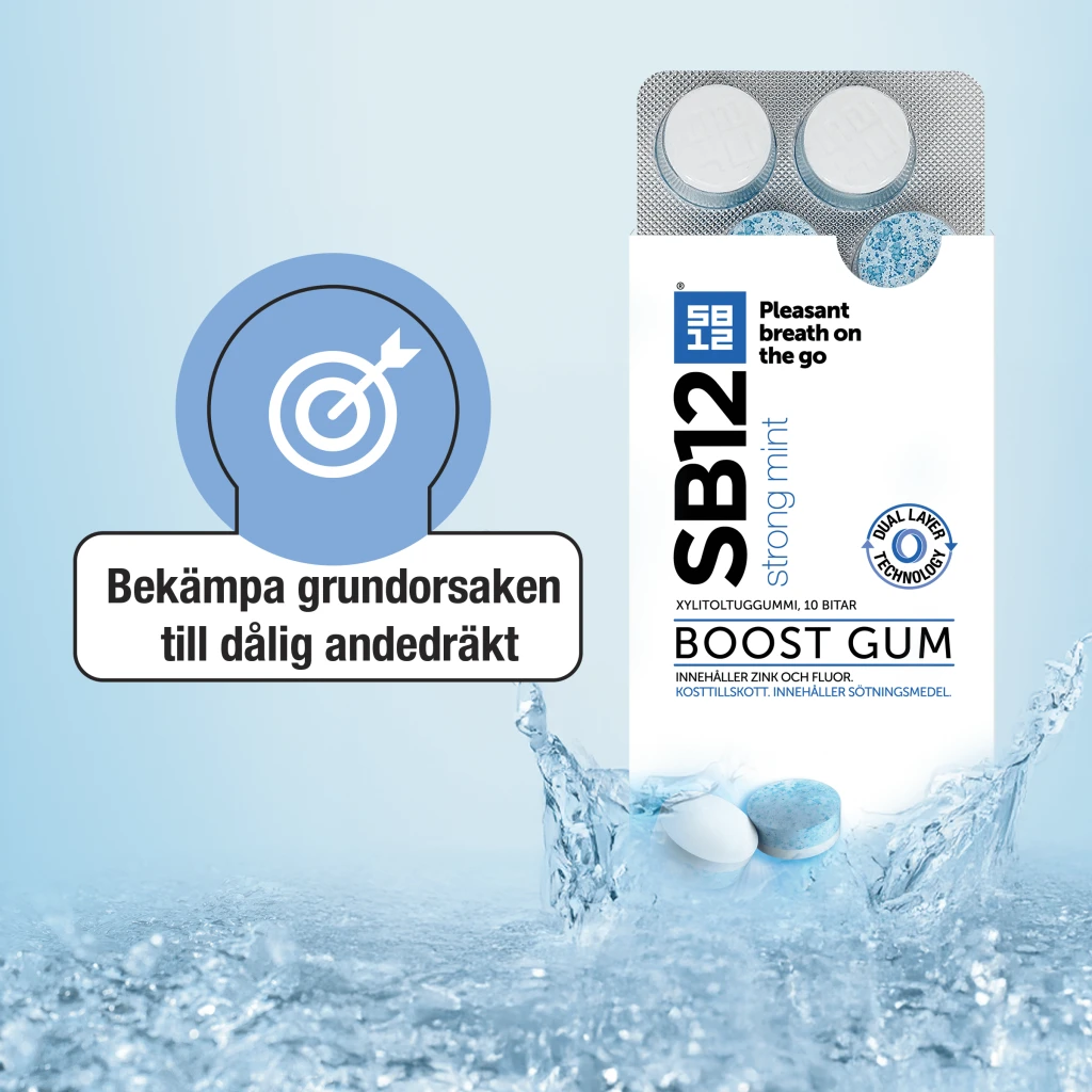 - Omedelbar fräschör för din andedräkt: SB12 Boost tuggummin, med ett dubbelt lager, innehåller zink som ger fräsch andedräkt och en ren känsla i munnen på några sekunder1 – oavsett om du är hemma eller på språng. Patenterad formula.