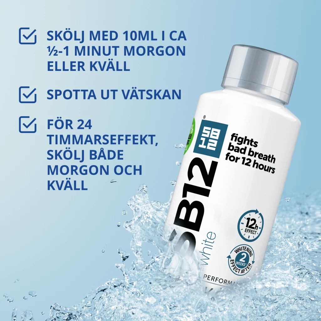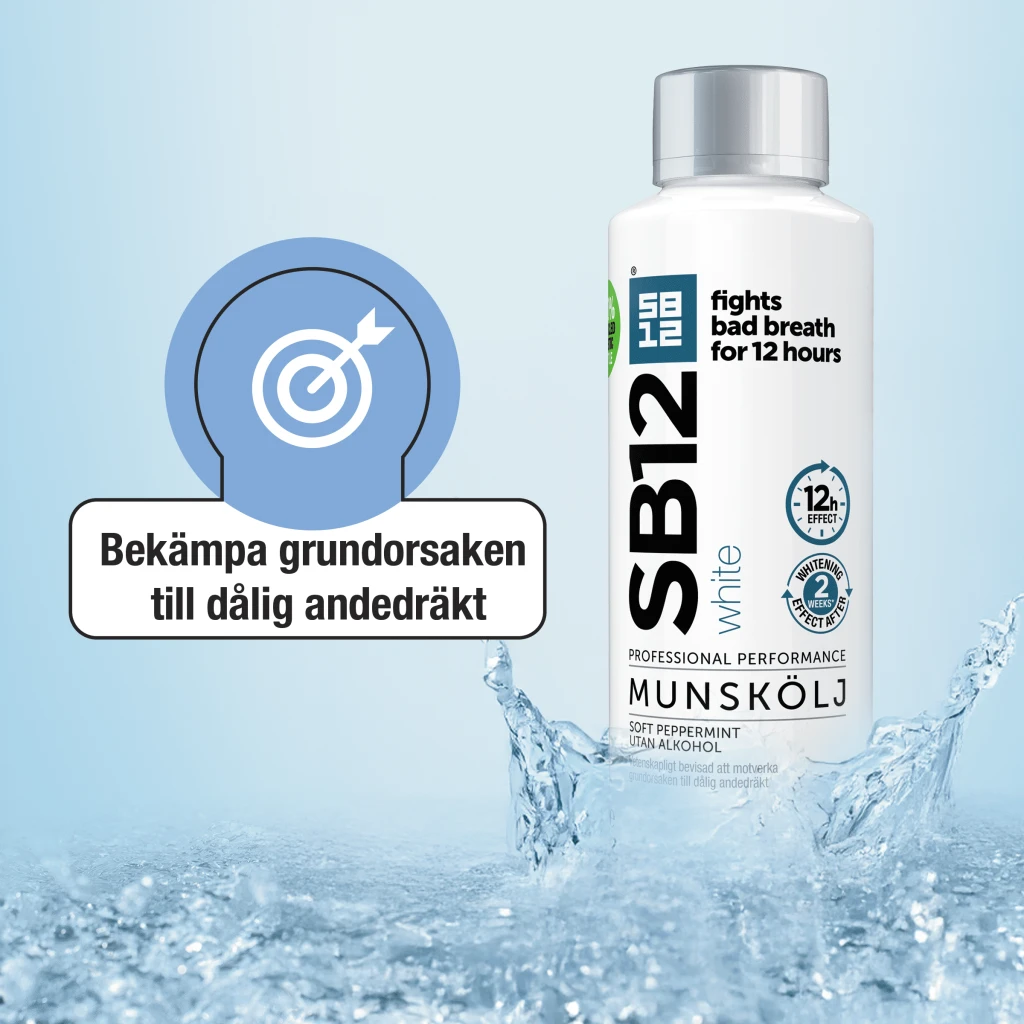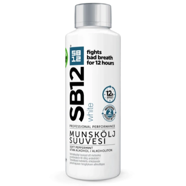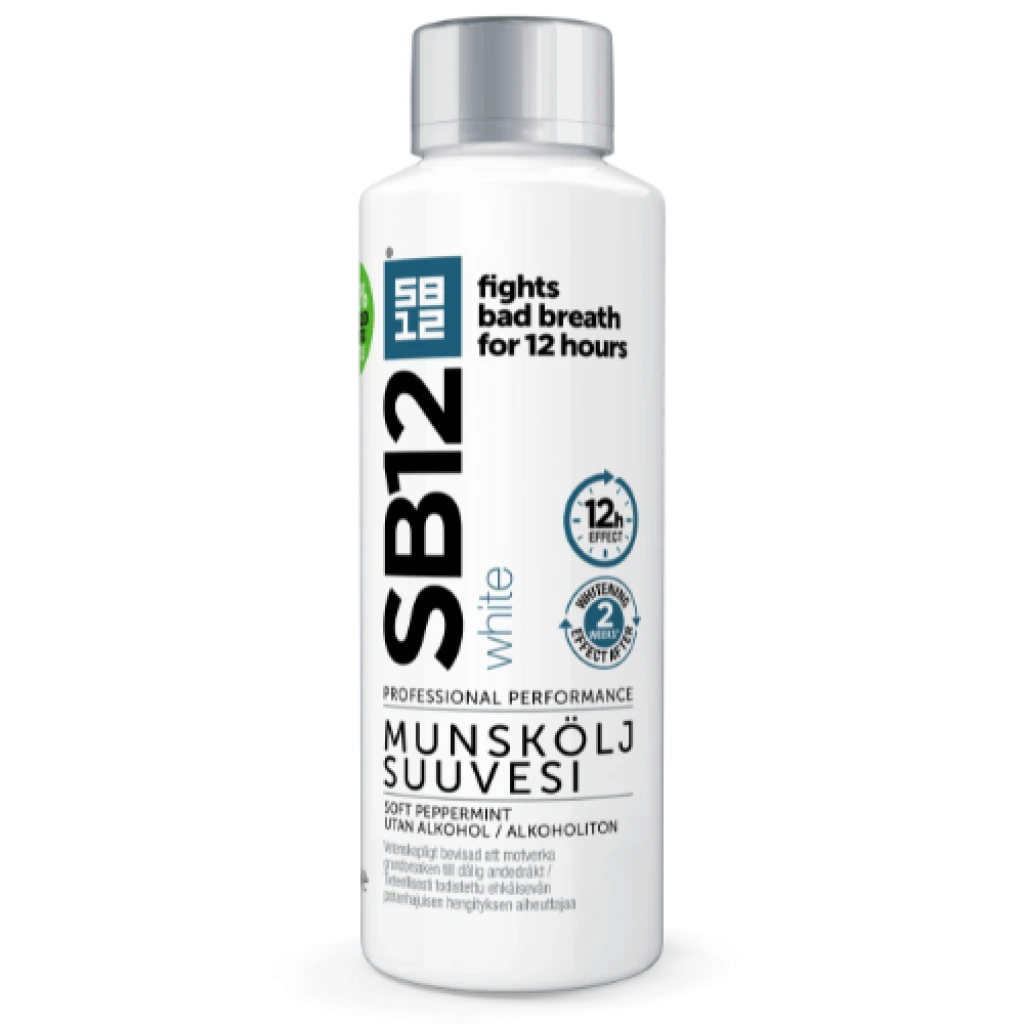 250 ml 500 mlFräsch andedräkt och vitare tänder med SB12 White. SB12 White är en alkoholfritt munskölj med soft peppermintsmak som vetenskapligt bevisat bekämpar grundorsaken till dålig andedräkt i 12 timmar den har även en whitening-effekt på tänderna om märks efter ca 2 veckors användning!⁵ Ej slipande eller blekande.